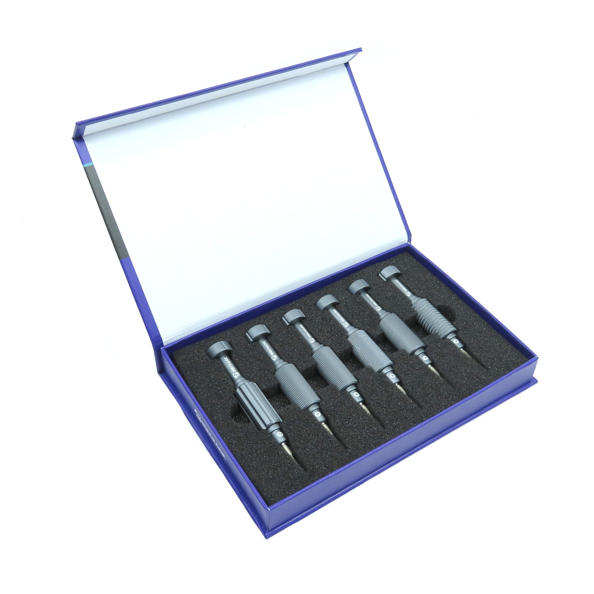 Este juego de destornilladores 6 en 1 incluye las siguientes puntas: cruceta 1.2, Torx T2, Pentalobe 0.8, Tri-Point 0.6 y cruceta 2.5, cubriendo una amplia variedad de tornillos usados en dispositivos electrónicos.