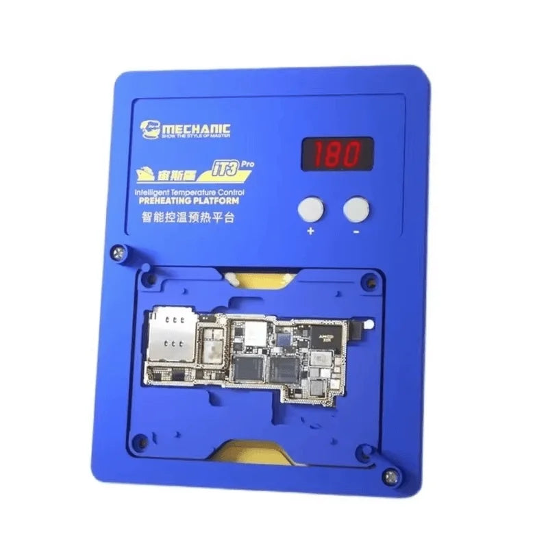 Plataforma de precalentamiento MECHANIC iT3 Pro diseñada para trabajos profesionales de reparación, microsoldadura y cambio de IC en dispositivos móviles. Su sistema de calentamiento uniforme permite elevar la temperatura de tarjetas lógicas, módulos y componentes sin riesgo de daño, facilitando la remoción y soldadura de chips con mayor seguridad y eficiencia. Fabricada con materiales de alta resistencia y equipada con controles precisos para un uso técnico confiable.