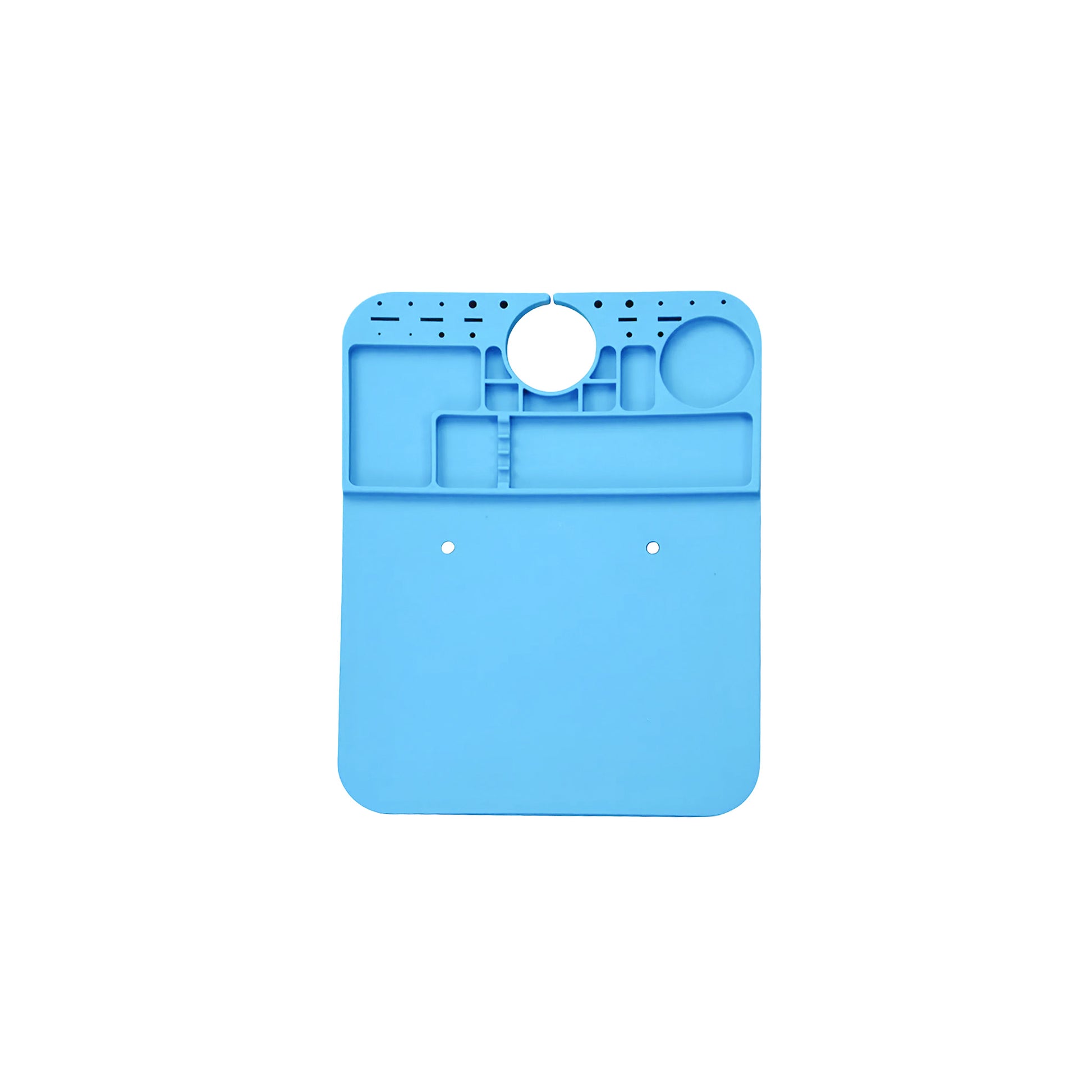 Su diseño incluye cavidades amplias en la parte superior y varias secciones rectangulares y circulares que ayudan a mantener cada pieza en su lugar. También cuenta con perforaciones y espacios destinados a sostener puntas, desarmadores o elementos delgados que se utilizan constantemente en el área de trabajo. El material es flexible, resistente y fácil de limpiar, lo que lo convierte en una superficie ideal para soldadura ligera, desmontaje de módulos y operaciones de precisión.